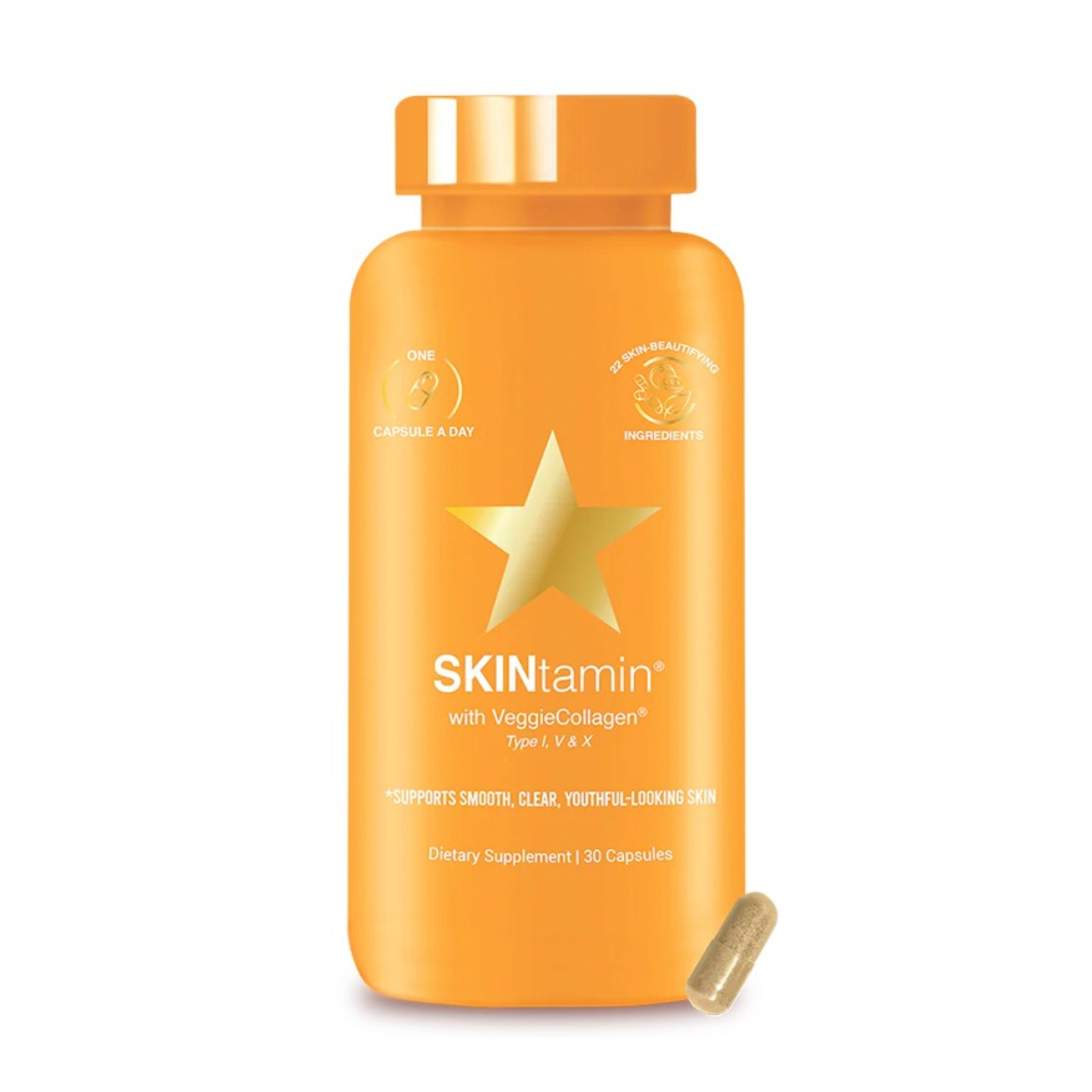 اسکین تامین برای زیبایی پوست با 22 ماده حاوی کلاژن (نوع I، V و X) که از غشای پوسته تخم مرغ، میوه ارگانیک آملا، عصاره زعفران، رسوراترول، ویتامین A، C، E، B12 تهیه شده است. قرص اسکین تامین همچنین دارای مولتی ویتامین های ماننده روی و اسید هیالورونیک برای حفظ سلامت پوست از درون به بیرون نیز میباشد و 1 اسکین تامین هیرتامین در روز مصرف پیشنهادی شرکت هیرتامین میباشد. کپسول اسکین تامین برای انوع پوست مناسب و برای خانم ها و آقایان قابل مصرف است و میتوانید با تمامی محصولات شرکت هیرتامین استفاده کرد.SKINtamin از نوعی کلاژن (VeggieCollagen) استفاده می کند که از پوسته تخم مرغ تهیه می شود که کاملا ارگانیک میباشد. افزایش کیفیت پوست
