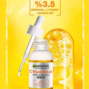 سوپر سرم ویتامین سی و نیاسینامید و سالیسیلیک اسید گارنیر اولین سرم با غلظت بالای 3.5% نیاسینامید + ویتامین C + اسید سالیسیلیک می باشد و در عرض 6 روز باعث کاهش ظاهر لکه های تیره شده و پوستی شفاف و بسیار درخشان خواهید داشت.
